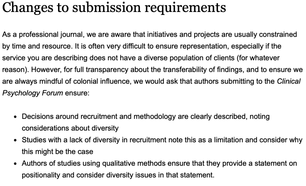 Below is a screen shot from an email I received recently from Clinical Psychology Forum (CPF) which outlines its revised guidance for submission of articles: